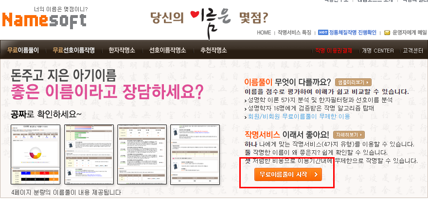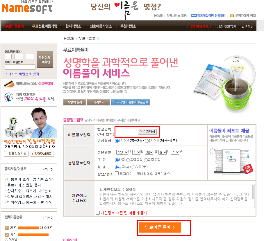 이름입력후 > 한자변환 > 무료이름 풀이시작