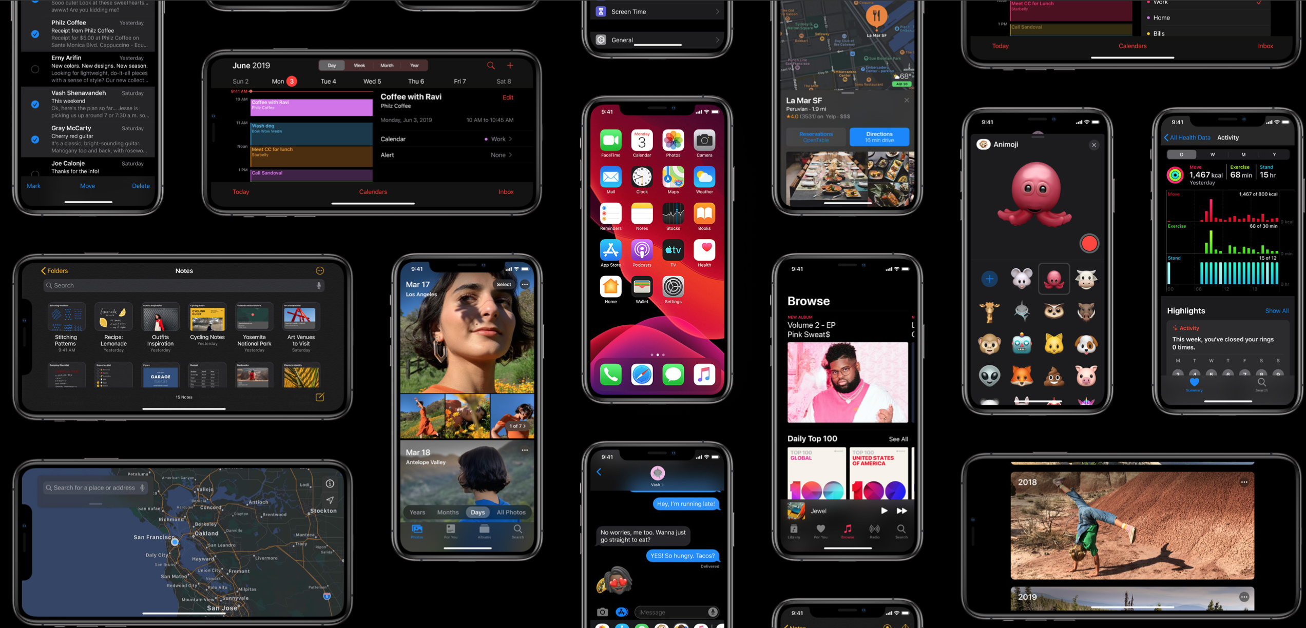 iOS 13에서 마침내 다크 모드(Dark Mode)가 적용되었다. 애플은 새로운 어두운 배경, 알림, 위젯 등을 선보였다. 메시지부터 메일, 뉴스 등 모든 애플 앱이 새로운 색상과 어두운 배경화면을 지원한다.