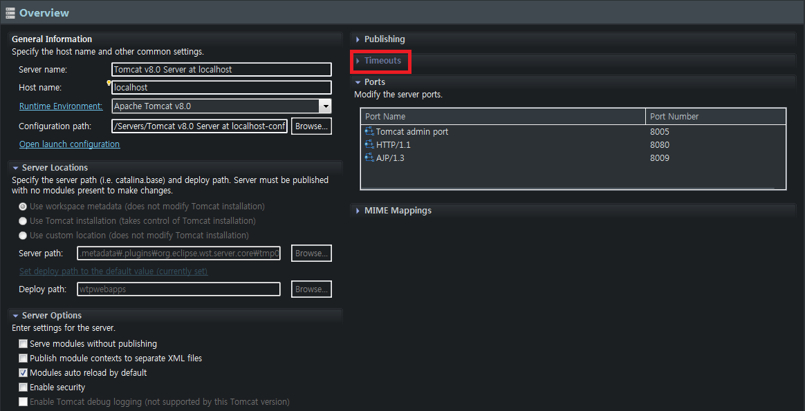 서버탭에 보면 Tomcat 서버 탭을 더블클릭한다.