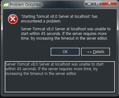 Server Tomcat v8.0 Server at localhost was unable to start within 45 seconds. If the server requires more time, try increasing the timeout in the server editor.